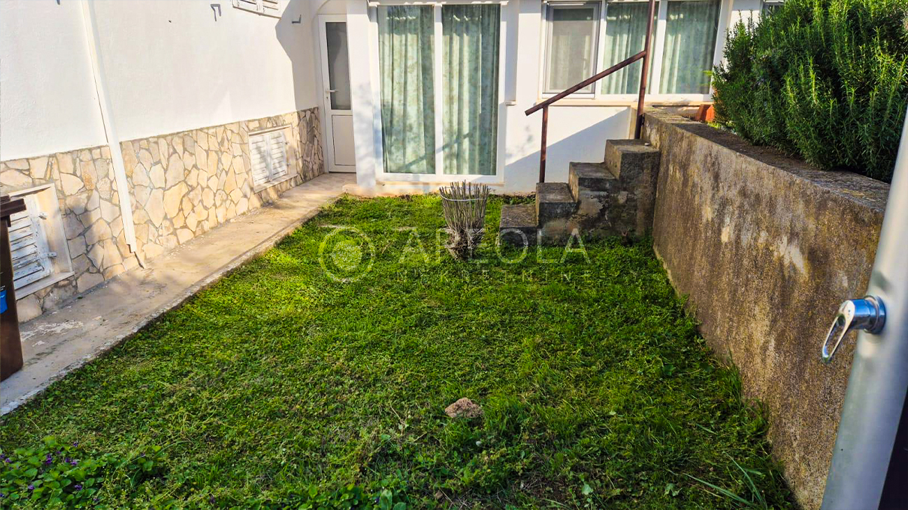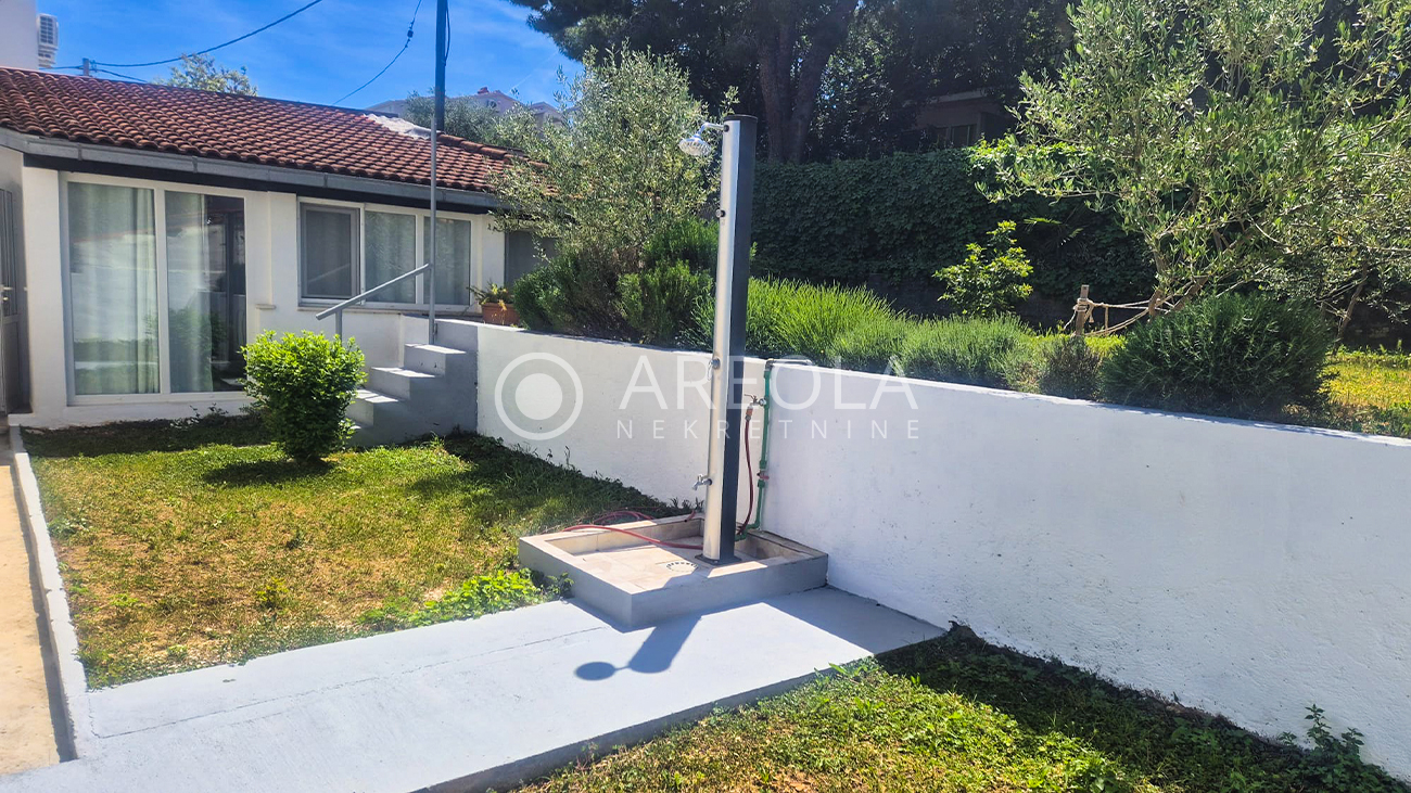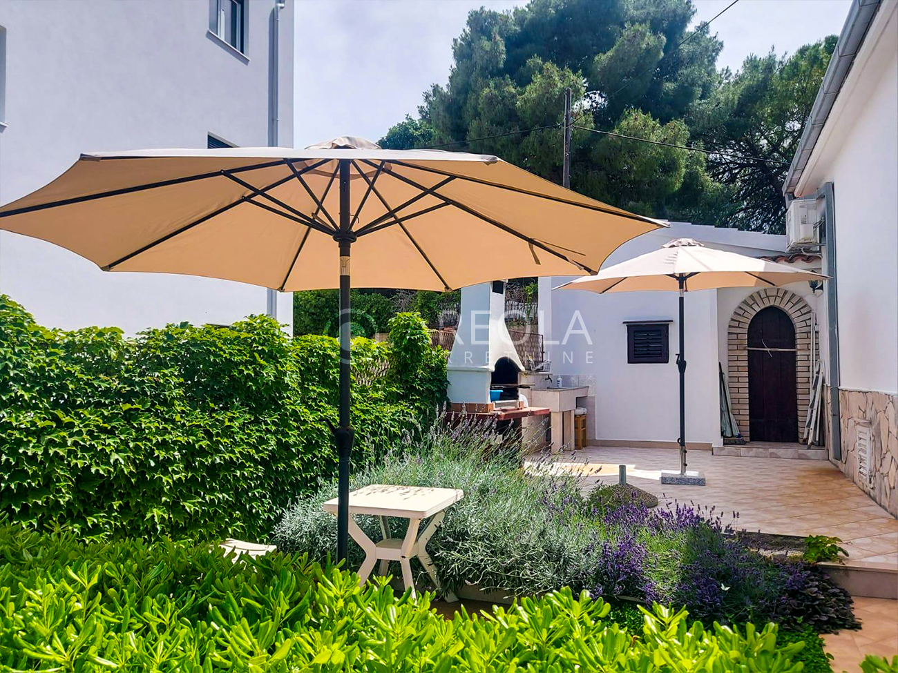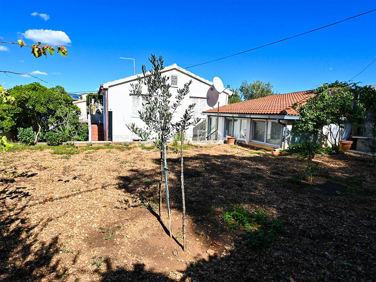 Ograđeno dvorište površine 309 m² uredno je uređeno i održavano, s naglašenim mediteranskim ugođajem kroz zelenilo, masline i ostalo bilje koje pruža prirodnu hladovinu i privatnost. U sklopu dvorišta nalazi se terasa s roštiljem te prostor za boravak na otvorenom, pogodan za svakodnevno korištenje, dok su unutar parcele osigurana i tri vanjska parkirna mjesta.