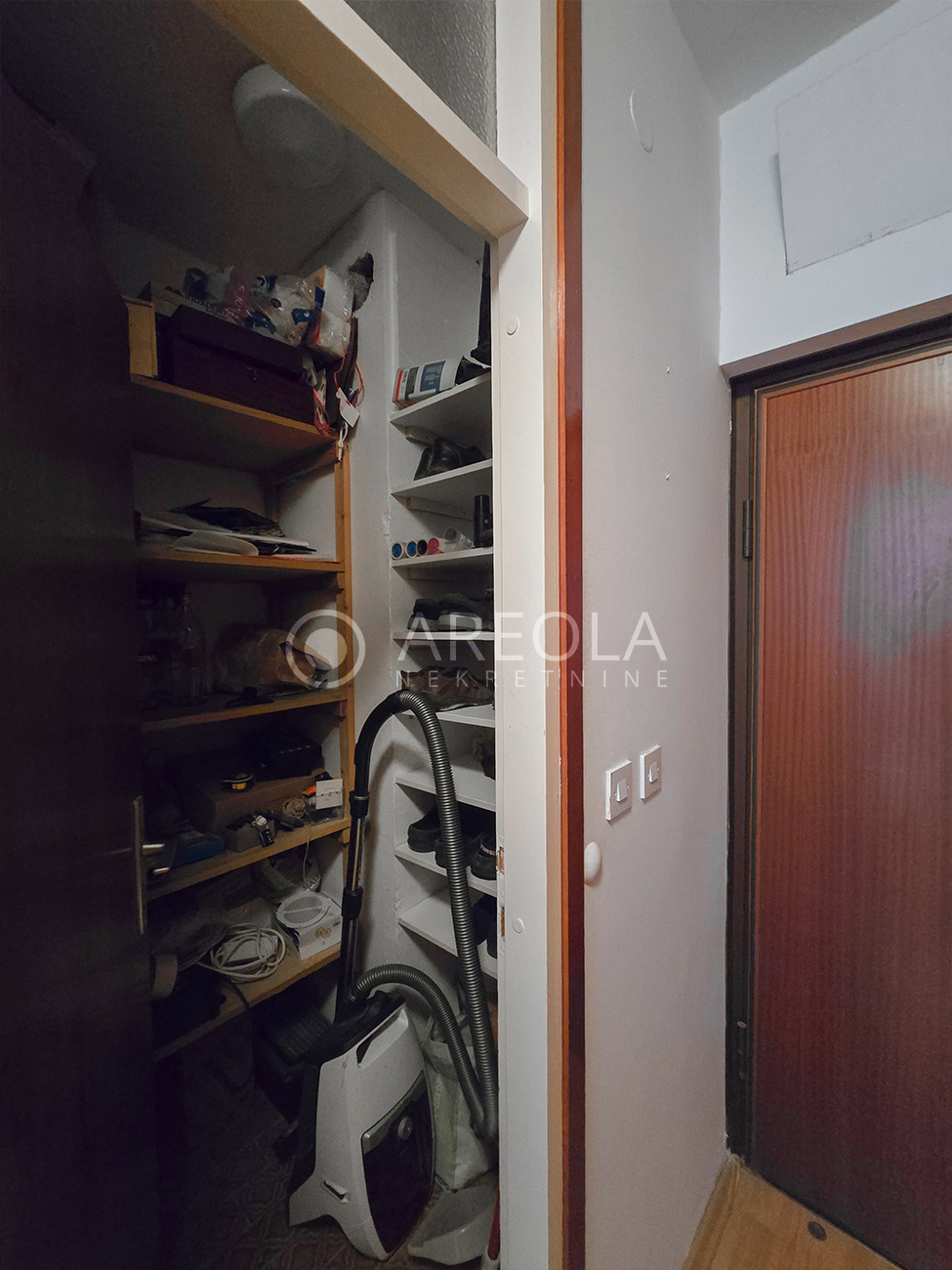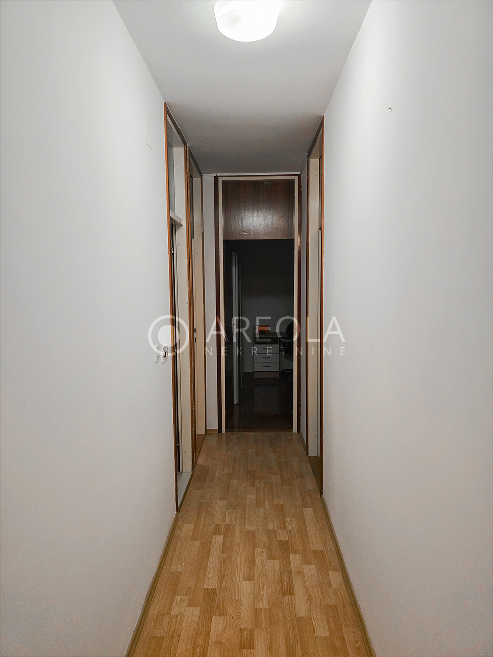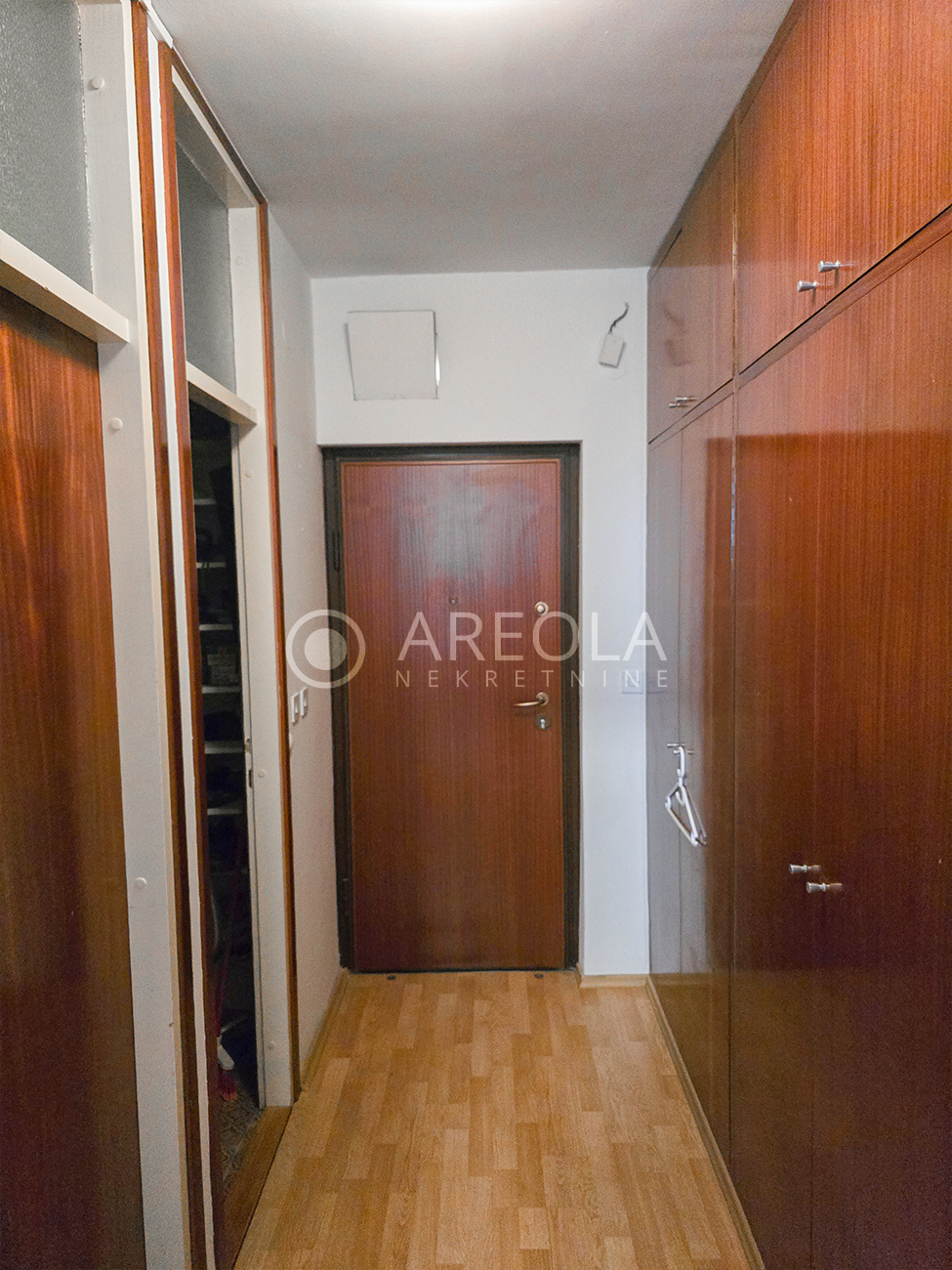 Prvi dio: hodnik s ugradbenim ormarima, iz kojeg se ulazi u kuhinju s blagovaonicom i dnevnim boravkom. Iz dnevnog dijela je izlaz na balkon i loggiu. Iz istog hodnika pristupa se i pomoćni WC-u te ostavi.